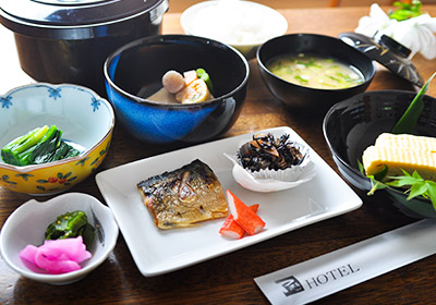 当館でお食事をご用意できます。朝の和食は大好評をいただいております。